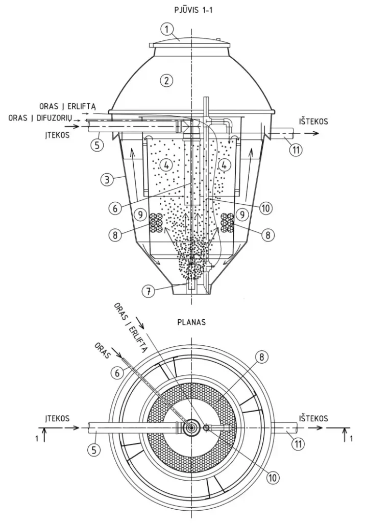 NVB/AF 1- Liukas; 2- Viršutinė korpuso dalis; 3- Apatinė korpuso dalis; 4 – Aeracinė kamera; 5- Įtekėjimo vamzdis; 6 – Oro tiekimo vamzdis; 7- Difuzorius; 8 – Įkrova; 9 – Antrinis nusodintuvas; 10. – Cirkuliacinio dumblo vamzdis (erliftas); 11- Išvalytų nuotekų ištekėjimo vamzdis. (Paveiksle pavaizduotos vamzdžių pajungimo kryptys yra orientacinio pobūdžio, kurios tikslinamos užsakymo metu)
