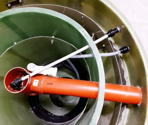 NVB/AF 1- Liukas; 2- Viršutinė korpuso dalis; 3- Apatinė korpuso dalis; 4 – Aeracinė kamera; 5- Įtekėjimo vamzdis; 6 – Oro tiekimo vamzdis; 7- Difuzorius; 8 – Įkrova; 9 – Antrinis nusodintuvas; 10. – Cirkuliacinio dumblo vamzdis (erliftas); 11- Išvalytų nuotekų ištekėjimo vamzdis. (Paveiksle pavaizduotos vamzdžių pajungimo kryptys yra orientacinio pobūdžio, kurios tikslinamos užsakymo metu)
